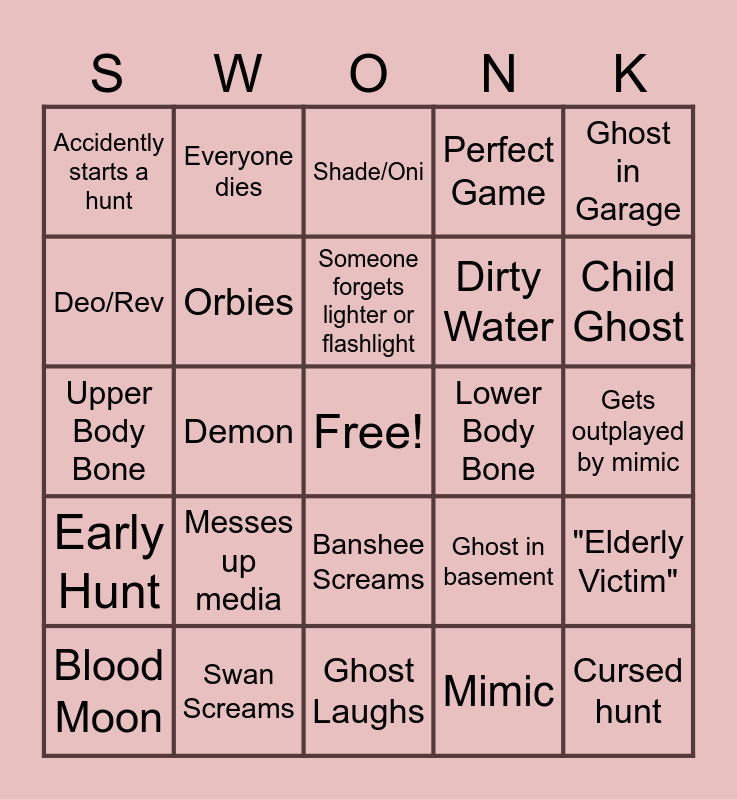 This bingo card has a free space and 29 words: Blood Moon, Swan Panics, Demon, Ghost Throws book, Accidently starts a hunt, Shade/Oni, Orbies, Messes up media, Lower Body Bone, Swan Screams, Gets outplayed by mimic, Cursed hunt, Ghost Laughs, Mimic, Child Ghost, Ghost in Bathroom, Banshee Screams, Early Hunt, Ghost in Garage, Upper Body Bone, Ghost in basement, Swan dies, Dirty Water, Deo/Rev, Perfect Game, Everyone dies, "Elderly Victim", Someone forgets lighter or flashlight and Gets ghost wrong.