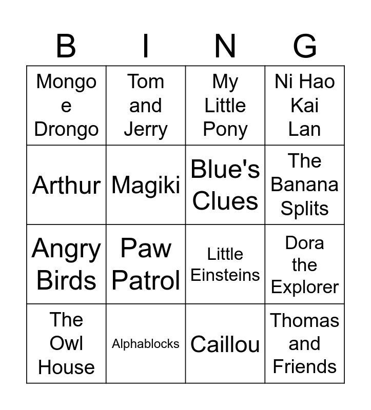 This bingo card has 16 words: Alphablocks, Dora the Explorer, My Little Pony, Mongo e Drongo, Angry Birds, Tom and Jerry, Little Einsteins, Caillou, Arthur, Magiki, The Owl House, Ni Hao Kai Lan, Paw Patrol, The Banana Splits, Blue's Clues and Thomas and Friends.