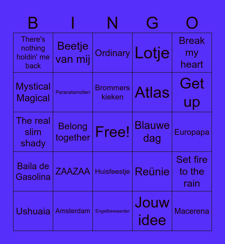 This bingo card has a free space and 88 words: APT, Sugardaddy, Huisfeestje, Terug in de tijd, Boevenpad, Alles op gevoel, Entourage, Anne-Fleur Vakantie, Industry Plant, Ga dan!, Die with a Smile, Blikkendag, Set fire to the rain, Europapa, Satisfyer, Brommers kieken, Casual, A Bar Song, Samen (niet alleen), A pimp named slickback, Automatisch, Het is een nacht, The real slim shady, Sofia, Jouw idee, Echte liefde is te koop, Messy, 100%, Anxiety, That's so true, Ordinary, Lotje, Espresso macchiato, C'est la vie, ZAAZAA, Mystical Magical, There's nothing holdin' me back, Ladada, Bara Bada Bastu, Get up, Belong together, Dark horse, Links rechts, Reünie, Blauwe dag, Hij is van mij, Azizam, Beautiful people, Ik zing, Atlas, Mona Lisa, Abracadabra, Shake it to the max, Baila bailalaa, Arrivederci, Lekker eigenwijs, Baila de Gasolina, Beetje van mij, Ze komt uit Amsterdam, Daba die daba daa, Ziggzagg, Ken je dat gevoel, Iconisch, Can't stop the feeling, De overkant, Amsterdam, Champions League, Paracetamollen, Ushuaia, Macerena, de pinguïndans, het vliegerlied, Tsjoe tsjoe wa, Break my heart, Zoet, zout, zuur, Waterdicht, Waka, Amalia, Engelbewaarder, Cupido, Dromendans, Brabant, Adrenaline, Bewegen is gezond, Oya lélé, Waterval, Mango Mango and Activeren.