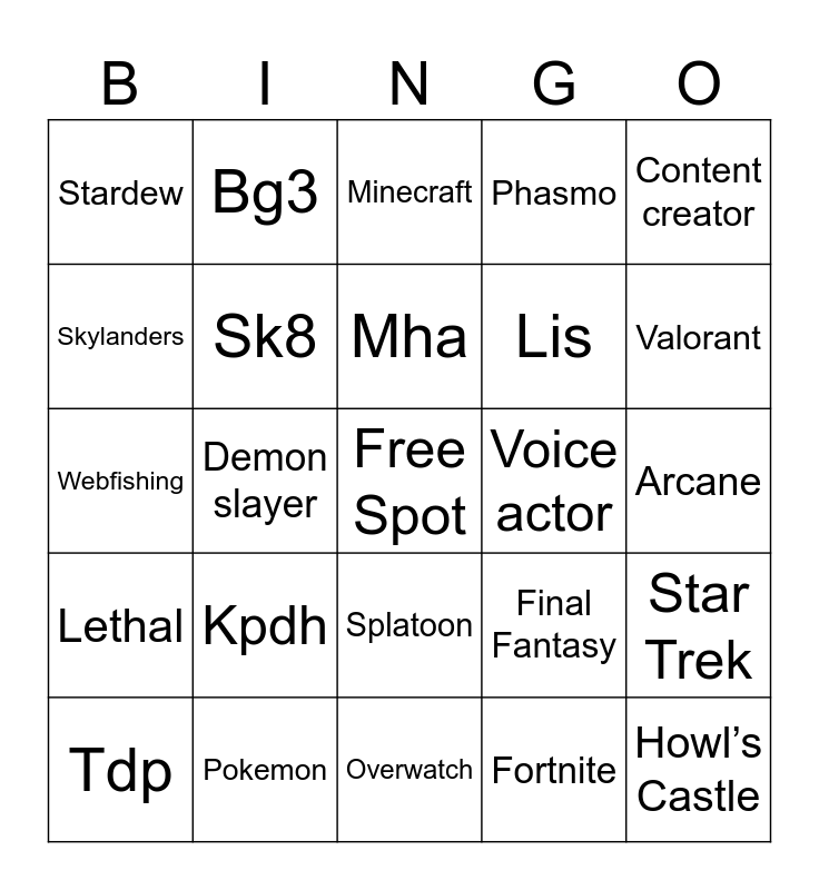 This bingo card has a free space and 24 words: Kpdh, Pokemon, Mha, Tdp, Content creator, Stardew, Skylanders, Bg3, Voice actor, Splatoon, Lis, Webfishing, Final Fantasy, Star Trek, Sk8, Fortnite, Arcane, Minecraft, Valorant, Demon slayer, Howl’s Castle, Lethal, Phasmo and Overwatch.