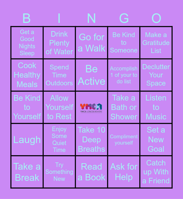 This bingo card has a free space and 24 words: Enjoy Some Quiet Time, Try Something New, Be Active, Take a Break, Make a Gratitude List, Get a Good Nights Sleep, Cook Healthy Meals, Drink Plenty of Water, Take a Bath or Shower, Take 10 Deep Breaths, Accomplish 1 of your to do list, Be Kind to Yourself, Compliment yourself, Set a New Goal, Spend Time Outdoors, Ask for Help, Listen to Music, Go for a Walk, Declutter Your Space, Allow Yourself to Rest, Catch up With a Friend, Laugh, Be Kind to Someone and Read a Book.