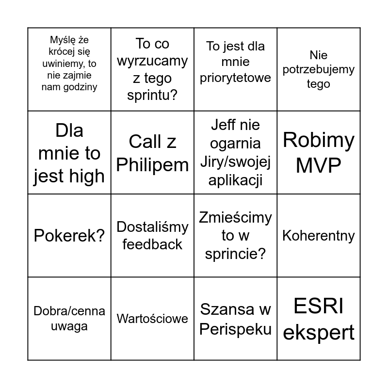 This bingo card has 16 words: Wartościowe, Koherentny, To jest dla mnie priorytetowe, Myślę że krócej się uwiniemy, to nie zajmie nam godziny, Pokerek?, To co wyrzucamy z tego sprintu?, Zmieścimy to w sprincie?, Szansa w Perispeku, Dla mnie to jest high, Call z Philipem, Dobra/cenna uwaga, Nie potrzebujemy tego, Dostaliśmy feedback, Robimy MVP, Jeff nie ogarnia Jiry/swojej aplikacji and ESRI ekspert.