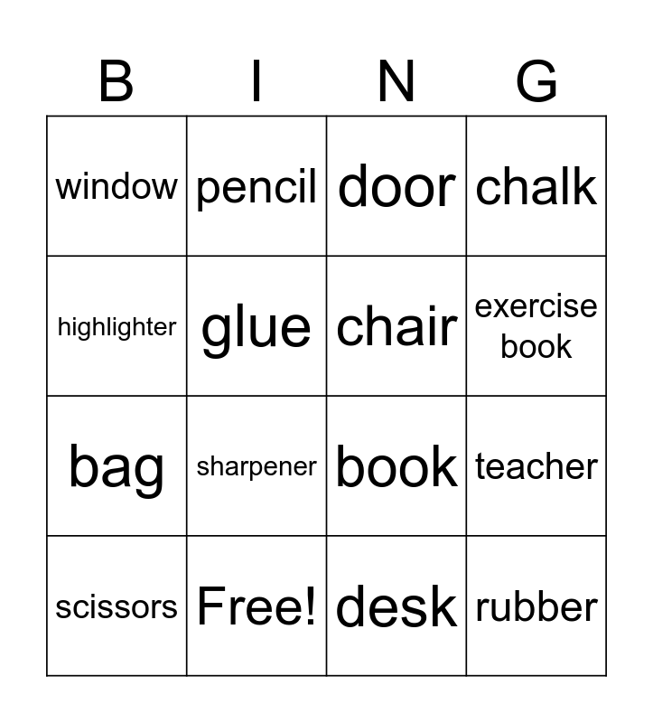 This bingo card has 21 words: Free!, pen, pencil, board, desk, chair, window, door, book, exercise book, bag, chalk, rubber, ruler, glue, pencil case, scissors, sharpener, highlighter, teacher and classsmate.