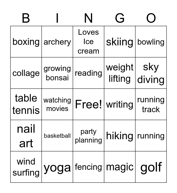 This bingo card has a free space and 71 words: cheerleading, archery, fishing, taekwondo, fencing, water skiing, skiing, jet skiing, weight lifting, scuba diving, wind surfing, kickboxing, sky diving, boxing, board games, table tennis, hiking, bowling, juggling, running track, basketball, golf, running, karate, horse racing, snowboarding, skateboarding, soccer, volleyball, badminton, yoga, floral design, jewelry making, clay crafts, magic, pottery/ceramics, makeup art, fashion design, collage, felt arts, party planning, miniatures, nail art, leather crafts, making dolls, designing clothes, carving, growing bonsai, collage making, printmaking, flower pressing, macrame, writing, crossword puzzles, sudoku, word scrambles, reading, singing, dancing, playing instruments, mountain climbing, eating, watching movies, drinking coffee, Loves to Travel, Loves to eat Ampalaya, Loves Ice cream, Went to Cebu, Went to Palawan, Loves Coffee and Has a pet.