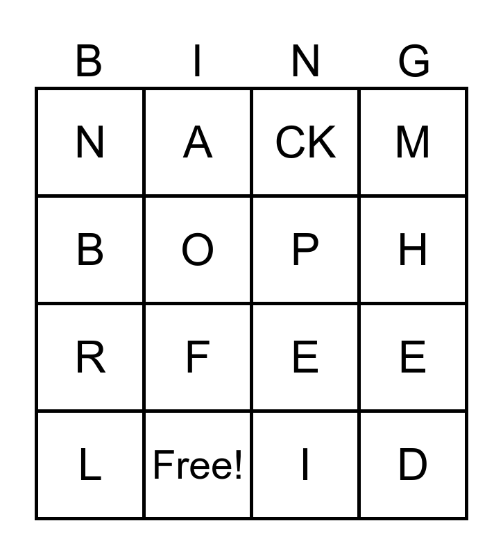 This bingo card has 21 words: Free!, S, A, T, I, P, N, CK, E, H, R, M, D, G, O, U, L, F, B, E and I.
