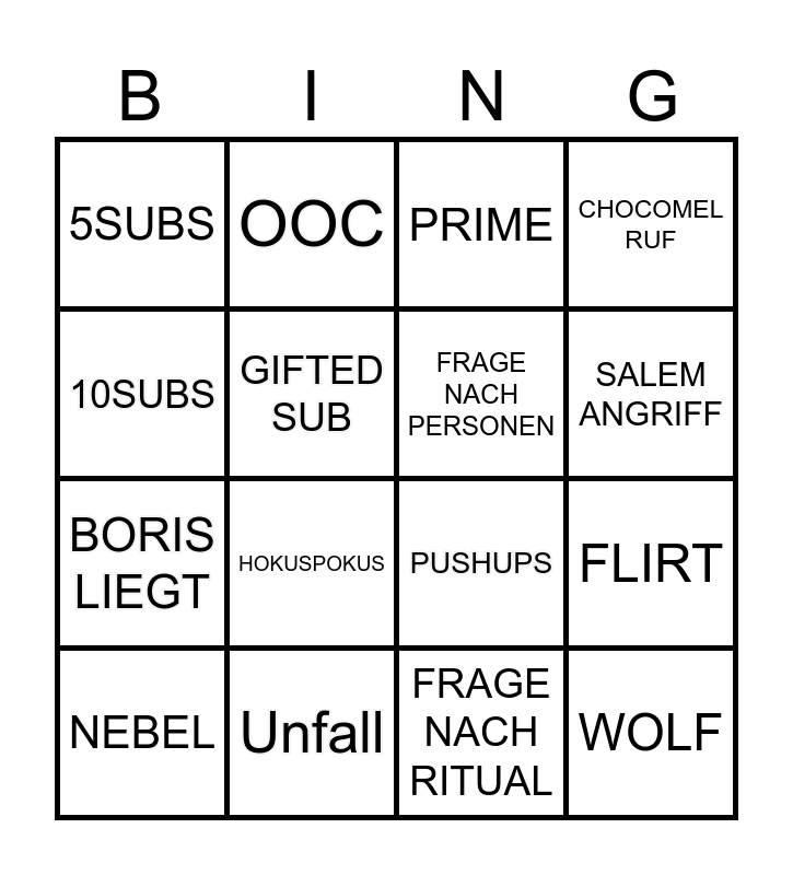 This bingo card has 16 words: Unfall, FLIRT, PRIME, 5SUBS, BORIS LIEGT, OOC, PUSHUPS, FRAGE NACH RITUAL, 10SUBS, GIFTED SUB, NEBEL, CHOCOMEL RUF, HOKUSPOKUS, SALEM ANGRIFF, FRAGE NACH PERSONEN and WOLF.