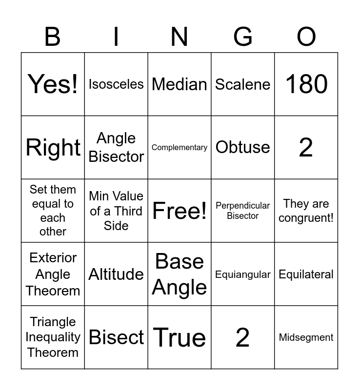 This bingo card has a free space and 29 words: Triangle Inequality Theorem, Max Value of a Third Side, Min Value of a Third Side, side 1 < X< side 2, Yes!, Median, Angle Bisector, Altitude, Perpendicular Bisector, Bisect, They are congruent!, Midsegment, True, 2, 2, Vertex Angle, Base Angle, Exterior Angle Theorem, 180, Set them equal to each other, Equiangular, Acute, Obtuse, Right, Scalene, Isosceles, Equilateral, Complementary and Supplementary.