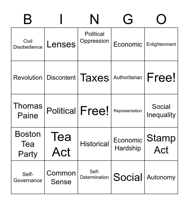 This bingo card has a free space and 24 words: Tea Act, Common Sense, Taxes, Self-Governance, Enlightenment, Civil Disobedience, Revolution, Lenses, Representation, Historical, Authoritarian, Thomas Paine, Economic Hardship, Stamp Act, Discontent, Social, Social Inequality, Political Oppression, Free!, Political, Autonomy, Boston Tea Party, Economic and Self-Determination.