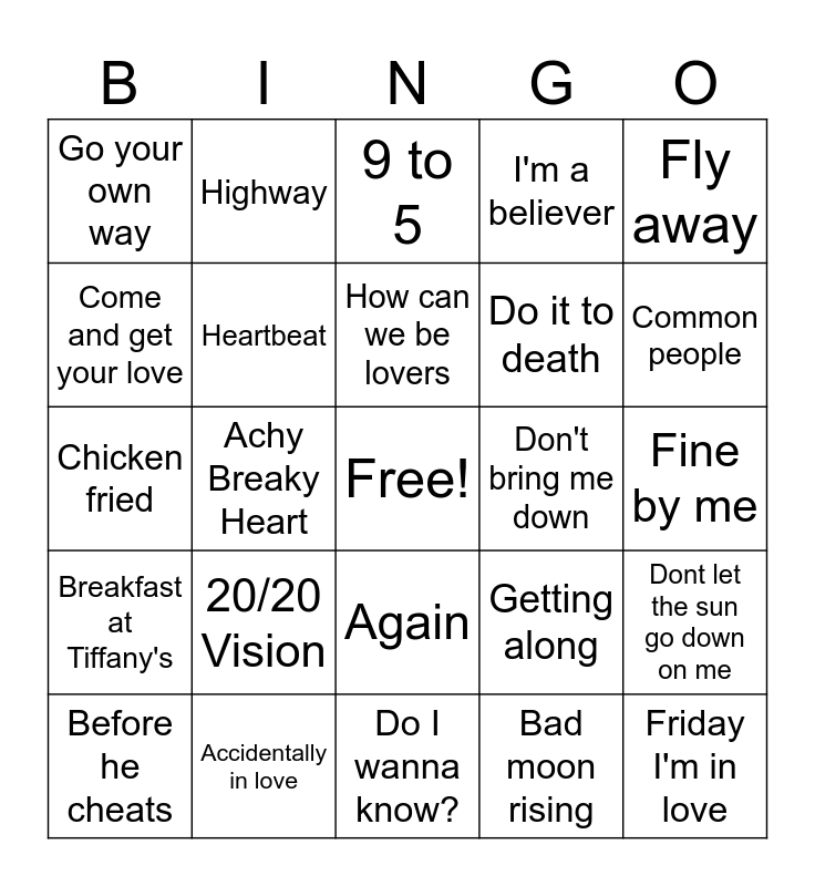 This bingo card has a free space and 24 words: 20/20 Vision, Accidentally in love, How can we be lovers, Before he cheats, Fly away, Go your own way, Come and get your love, Highway, Don't bring me down, Again, Do it to death, Chicken fried, Getting along, Dont let the sun go down on me, Heartbeat, Bad moon rising, Fine by me, 9 to 5, Common people, Achy Breaky Heart, Friday I'm in love, Breakfast at Tiffany's, I'm a believer and Do I wanna know?.