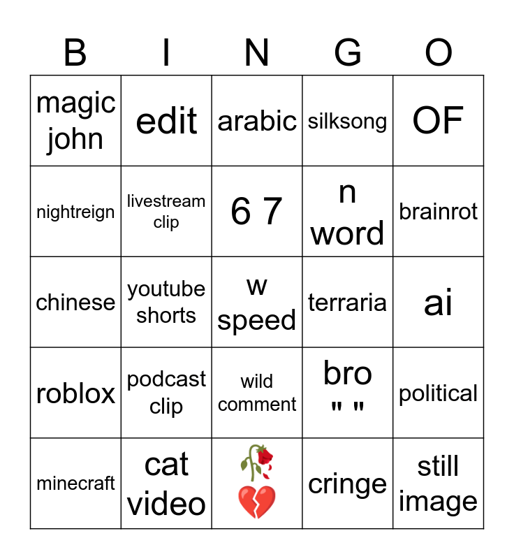 This bingo card has a free space and 24 words: podcast clip, cat video, 6 7, minecraft, OF, magic john, nightreign, edit, terraria, wild comment, n word, chinese, bro " ", political, livestream clip, cringe, ai, arabic, brainrot, youtube shorts, still image, roblox, silksong and 🥀💔.