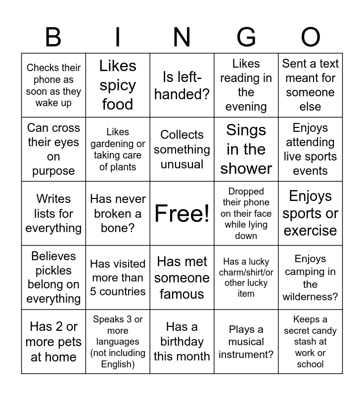 This bingo card has a free space and 24 words: Has visited more than 5 countries, Speaks 3 or more languages (not including English), Collects something unusual, Has 2 or more pets at home, Sent a text meant for someone else, Checks their phone as soon as they wake up, Can cross their eyes on purpose, Likes spicy food, Dropped their phone on their face while lying down, Has met someone famous, Sings in the shower, Writes lists for everything, Has a lucky charm/shirt/or other lucky item, Enjoys camping in the wilderness?, Likes gardening or taking care of plants, Plays a musical instrument?, Enjoys sports or exercise, Is left-handed?, Enjoys attending live sports events, Has never broken a bone?, Keeps a secret candy stash at work or school, Believes pickles belong on everything, Likes reading in the evening and Has a birthday this month.