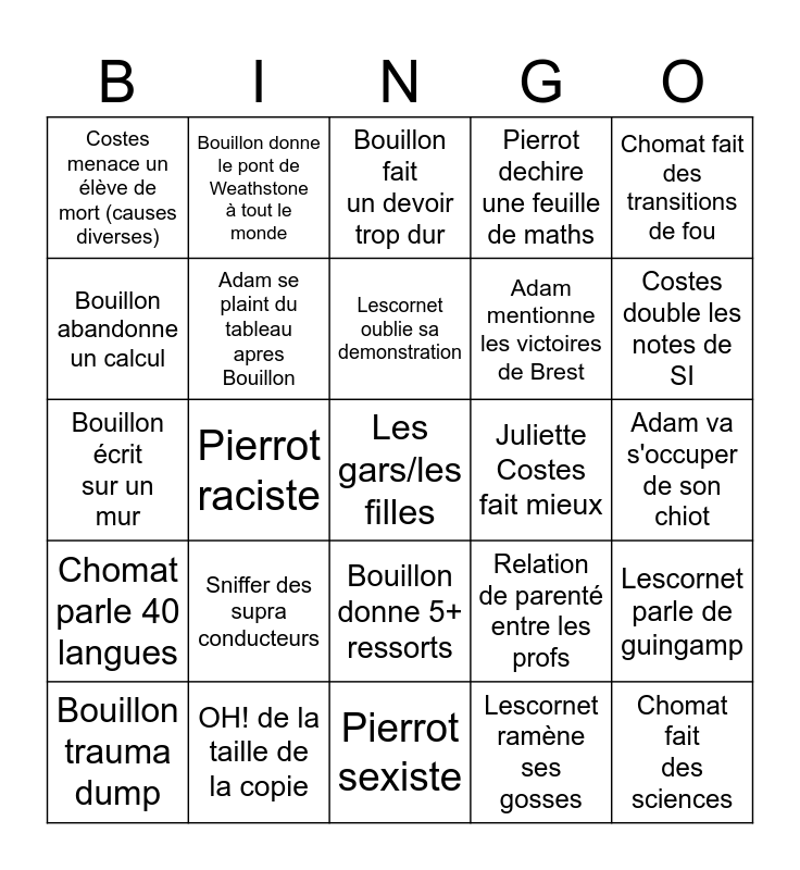 This bingo card has a free space and 24 words: Sniffer des supra conducteurs, OH! de la taille de la copie, Lescornet oublie sa demonstration, Bouillon trauma dump, Chomat fait des transitions de fou, Costes menace un élève de mort (causes diverses), Bouillon abandonne un calcul, Bouillon donne le pont de Weathstone à tout le monde, Juliette Costes fait mieux, Bouillon donne 5+ ressorts, Adam mentionne les victoires de Brest, Bouillon écrit sur un mur, Relation de parenté entre les profs, Lescornet parle de guingamp, Adam se plaint du tableau apres Bouillon, Lescornet ramène ses gosses, Adam va s'occuper de son chiot, Bouillon fait un devoir trop dur, Costes double les notes de SI, Pierrot raciste, Chomat fait des sciences, Chomat parle 40 langues, Pierrot dechire une feuille de maths and Pierrot sexiste.