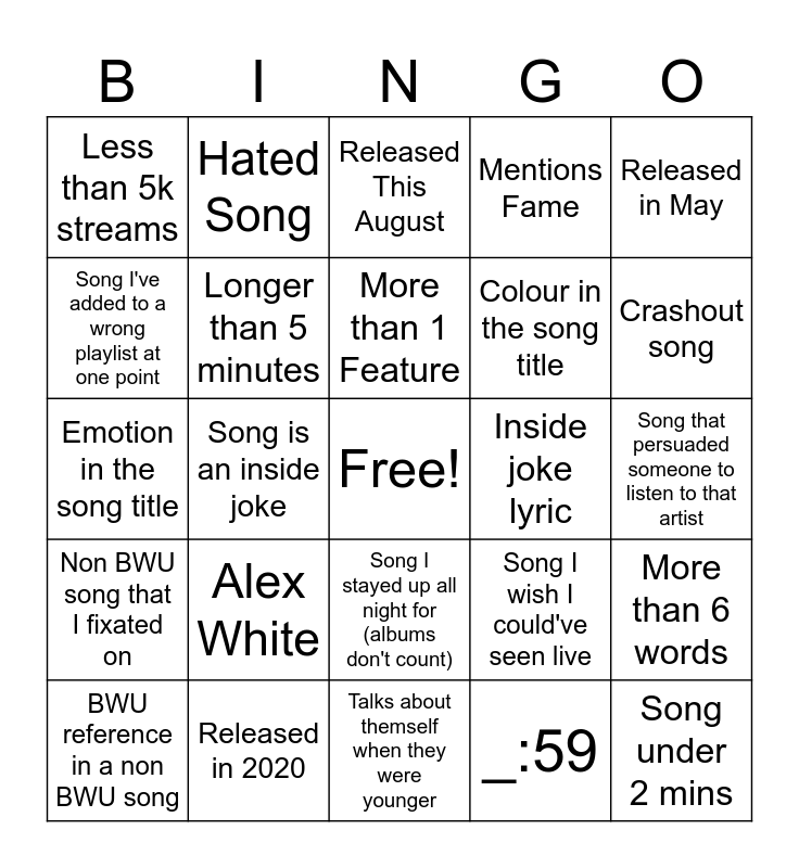 This bingo card has a free space and 24 words: Alex White, Released in 2020, More than 1 Feature, BWU reference in a non BWU song, Released in May, Less than 5k streams, Song I've added to a wrong playlist at one point, Hated Song, Inside joke lyric, Song I stayed up all night for (albums don't count), Colour in the song title, Emotion in the song title, Song I wish I could've seen live, More than 6 words, Longer than 5 minutes, _:59, Song that persuaded someone to listen to that artist, Released This August, Crashout song, Song is an inside joke, Song under 2 mins, Non BWU song that I fixated on, Mentions Fame and Talks about themself when they were younger.