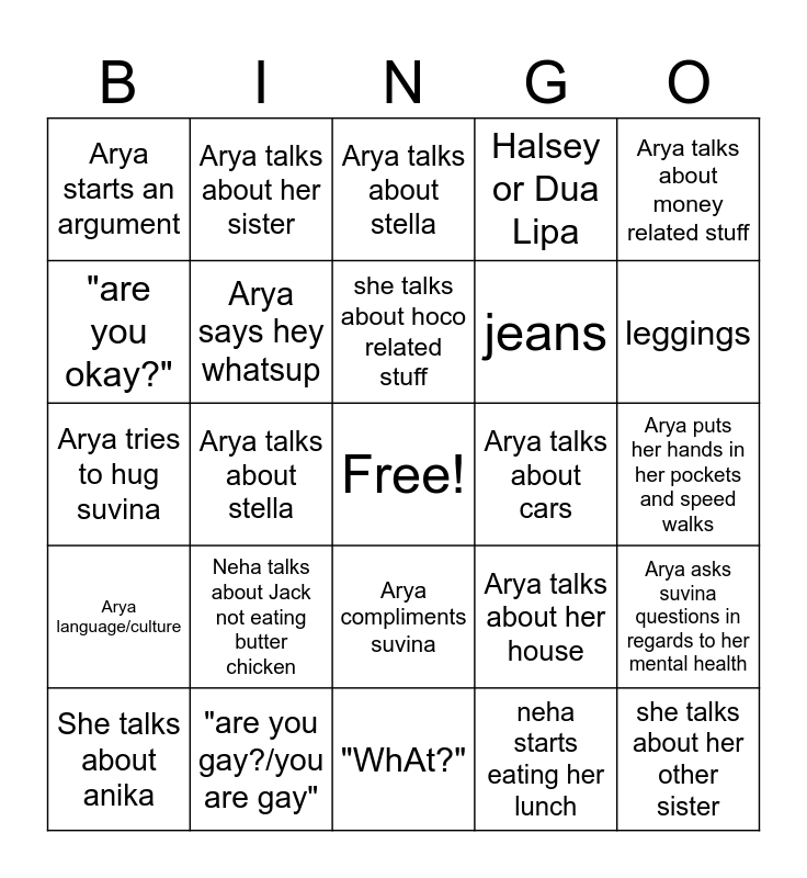 This bingo card has a free space and 24 words: She talks about anika, Neha talks about Jack not eating butter chicken, she talks about hoco related stuff, neha starts eating her lunch, Arya talks about money related stuff, Arya starts an argument, Arya talks about her sister, Arya talks about stella, Arya talks about cars, Arya puts her hands in her pockets and speed walks, Arya tries to hug suvina, Arya says hey whatsup, Arya talks about her house, Arya asks suvina questions in regards to her mental health, "are you okay?", "are you gay?/you are gay", "WhAt?", Halsey or Dua Lipa, leggings, Arya language/culture, Arya talks about stella, Arya compliments suvina, jeans and she talks about her other sister.