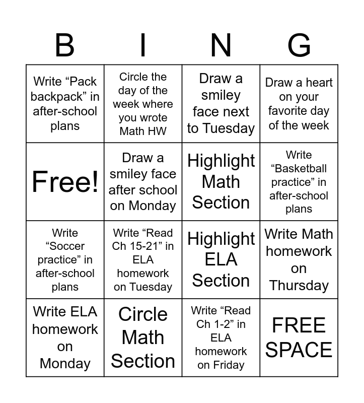 This bingo card has 16 words: Circle Math Section, Write Math homework on Thursday, Draw a smiley face next to Tuesday, Write “Pack backpack” in after-school plans, Write “Soccer practice” in after-school plans, Circle the day of the week where you wrote Math HW, Highlight ELA Section, Write “Read Ch 1-2” in ELA homework on Friday, Free!, Draw a smiley face after school on Monday, Write ELA homework on Monday, Draw a heart on your favorite day of the week, Write “Read Ch 15-21” in ELA homework on Tuesday, Write “Basketball practice” in after-school plans, Highlight Math Section and FREE SPACE.