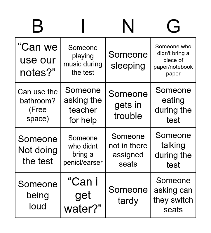 This bingo card has 16 words: “Can i get water?”, Someone talking during the test, Someone sleeping, “Can we use our notes?”, Someone Not doing the test, Someone playing music during the test, Someone not in there assigned seats, Someone tardy, Can use the bathroom? (Free space), Someone asking the teacher for help, Someone being loud, Someone who didn't bring a piece of paper/notebook paper, Someone who didnt bring a penicl/earser, Someone eating during the test, Someone gets in trouble and Someone asking can they switch seats.