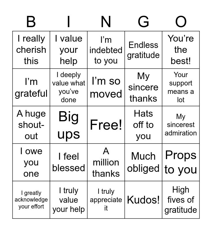 This bingo card has a free space and 27 words: Much obliged, Thank you very much, My sincere thanks, I truly appreciate it, I’m grateful, I’m indebted to you, I value your help, I owe you one, Hats off to you, Props to you, A huge shout-out, Endless gratitude, I greatly acknowledge your effort, I truly value your help, Your support means a lot, I’m touched by your kindness, I deeply value what you’ve done, I’m so moved, I feel blessed, I really cherish this, My sincerest admiration, Kudos!, Big ups, High fives of gratitude, A million thanks, You’re the best! and Endless kudos.