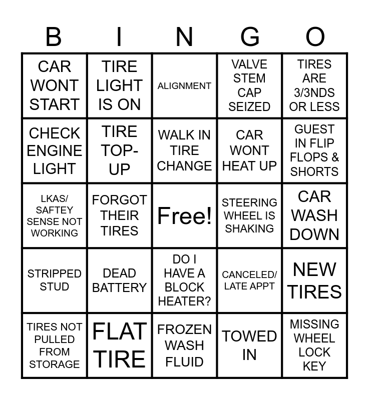 This bingo card has a free space and 24 words: DEAD BATTERY, FLAT TIRE, WALK IN TIRE CHANGE, TIRES NOT PULLED FROM STORAGE, TIRES ARE 3/3NDS OR LESS, CAR WONT START, CHECK ENGINE LIGHT, TIRE LIGHT IS ON, STEERING WHEEL IS SHAKING, DO I HAVE A BLOCK HEATER?, CAR WONT HEAT UP, LKAS/ SAFTEY SENSE NOT WORKING, CANCELED/ LATE APPT, NEW TIRES, TIRE TOP- UP, TOWED IN, CAR WASH DOWN, ALIGNMENT, GUEST IN FLIP FLOPS & SHORTS, FORGOT THEIR TIRES, MISSING WHEEL LOCK KEY, STRIPPED STUD, VALVE STEM CAP SEIZED and FROZEN WASH FLUID.