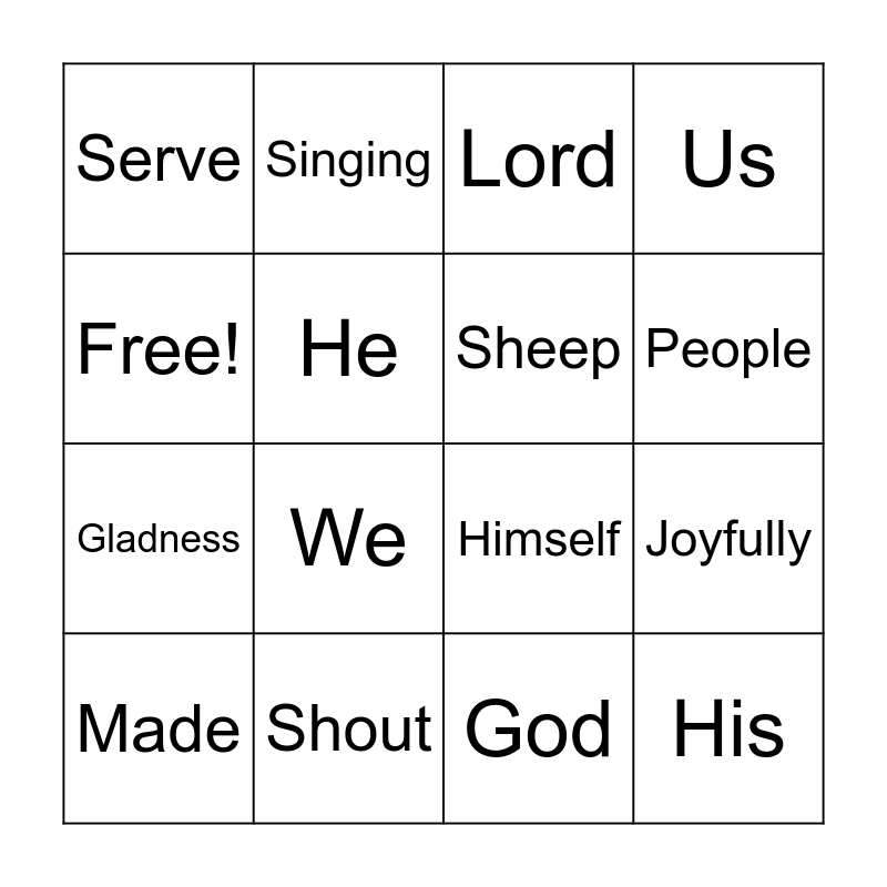 This bingo card has 16 words: Shout, Joyfully, Lord, Serve, Gladness, Singing, Himself, God, Free!, He, Made, Us, We, People, Sheep and His.