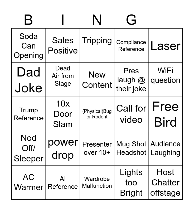 This bingo card has 43 words: Free!, (Physical)Bug or Rodent, AC Colder, AC Warmer, Audio up, Lights too Bright, Tripping, Presnter over time, Laser, AI Reference, Compliance Reference, Call for video, Presenter over 10+, power drop, camera Crew Disruption, Wardrobe Malfunction, Audience Question x5, Trump Reference, Cell phone noise in crowd, WiFi question, Sales Positive, Applause, ROS update, Soda Can Opening, sales -, Free Bird, lost clicker, Milk carton Headshot, Mug Shot Headshot, Nod Off/ Sleeper, Video Q from Stage, Audience Laughing, 5x Door Slam, 10x Door Slam, Equip movement, Wifi/Interweb drop, Host Chatter offstage, New Content, Dad Joke, Pres laugh @ their joke, Host Answers their own ??, Dead Air from Stage and Disruptive Attendee.