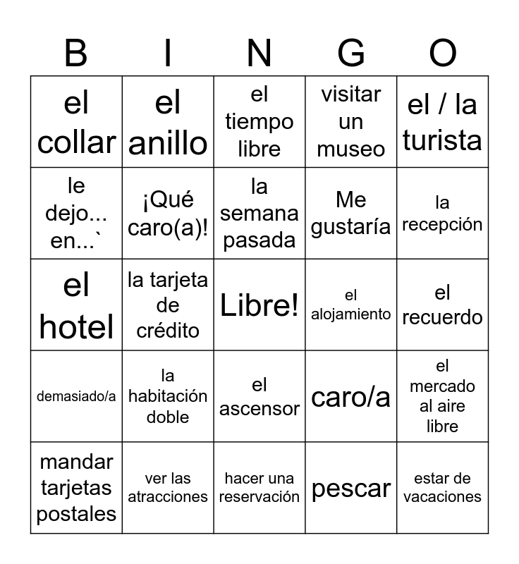This bingo card has a free space and 43 words: acampar, estar de vacaciones, hacer una excursión, mandar tarjetas postales, montar a caballo, pescar, el tiempo libre, tomar fotos, el / la turista, ver las atracciones, visitar un museo, el alojamiento, el ascensor, la habitación doble, la habitación individual, hacer una reservación, el hostal, el hotel, la llave, la recepción, el anillo, el arete, las artesanías, el collar, las joyas, el recuerdo, la tarjeta postal, bello/a, caro/a, demasiado/a, el dinero en efectivo, el mercado al aire libre, regatear, la tarjeta de crédito, anteayer, el año pasado, el mes pasado, la semana pasada, le dejo... en...`, Me gustaría, ¿Podría ver...?, ¡Qué caro(a)! and ¡Qué bello(a).