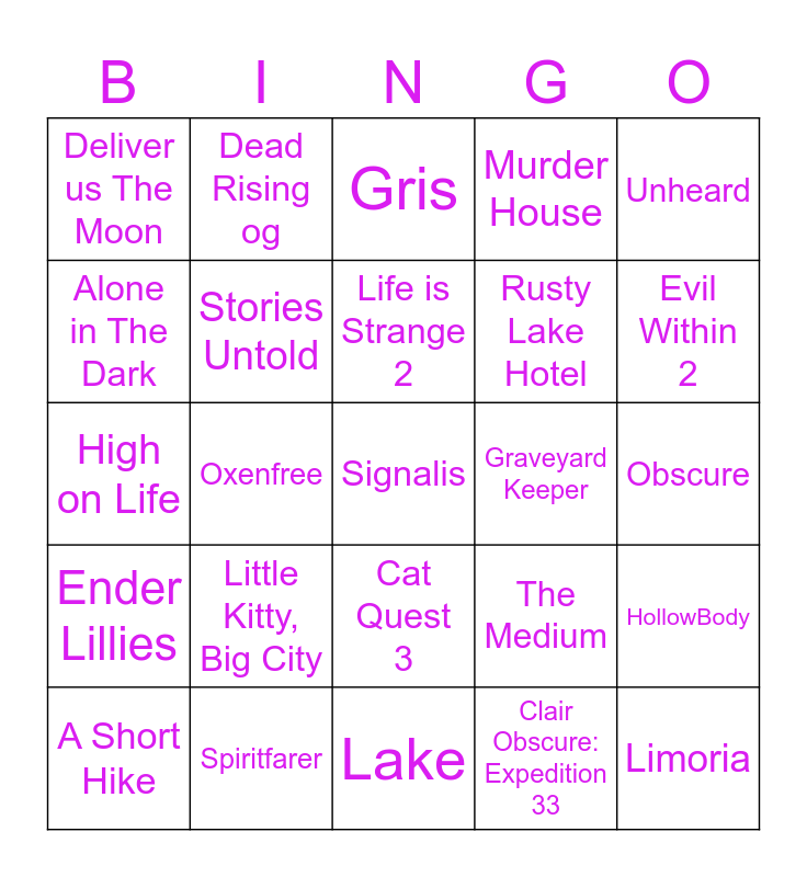 This bingo card has a free space and 24 words: Little Kitty, Big City, Spiritfarer, Life is Strange 2, A Short Hike, Unheard, Deliver us The Moon, Alone in The Dark, Dead Rising og, Graveyard Keeper, Cat Quest 3, Rusty Lake Hotel, High on Life, The Medium, HollowBody, Stories Untold, Clair Obscure: Expedition 33, Obscure, Gris, Evil Within 2, Oxenfree, Limoria, Ender Lillies, Murder House and Lake.
