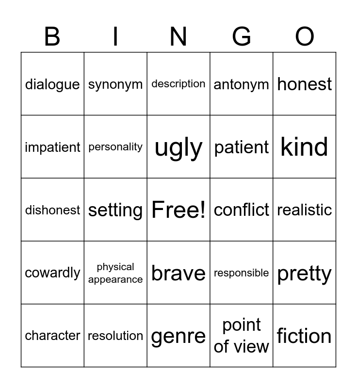 This bingo card has a free space and 29 words: character, plot, setting, theme, dialogue, description, personality, physical appearance, conflict, resolution, realistic, fiction, genre, point of view, kind, mean, brave, cowardly, honest, dishonest, responsible, irresponsible, patient, impatient, antonym, synonym, pretty, ugly and nonfiction.