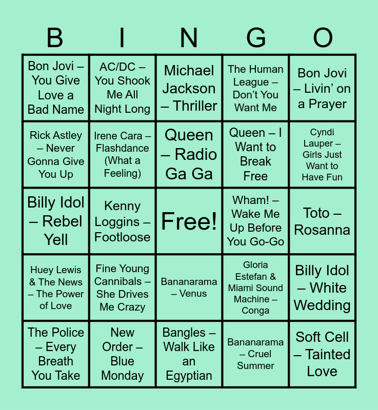 This bingo card has a free space and 76 words: Michael Jackson – Billie Jean, Michael Jackson – Beat It, Michael Jackson – Thriller, Madonna – Like a Virgin, Madonna – Material Girl, Madonna – Into the Groove, Prince – 1999, Prince – Purple Rain, Prince – Kiss, Whitney Houston – I Wanna Dance with Somebody, Whitney Houston – How Will I Know, George Michael – Faith, Wham! – Wake Me Up Before You Go-Go, Cyndi Lauper – Girls Just Want to Have Fun, Cyndi Lauper – Time After Time, Irene Cara – Flashdance (What a Feeling), Donna Summer – She Works Hard for the Money, Gloria Estefan & Miami Sound Machine – Conga, Lionel Richie – All Night Long, Rick Astley – Never Gonna Give You Up, Queen – Another One Bites the Dust, Queen – Radio Ga Ga, Queen – I Want to Break Free, Bon Jovi – Livin’ on a Prayer, Bon Jovi – You Give Love a Bad Name, Journey – Don’t Stop Believin’, Journey – Any Way You Want It, Guns N’ Roses – Sweet Child o’ Mine, Def Leppard – Pour Some Sugar on Me, Survivor – Eye of the Tiger, Bryan Adams – Summer of ’69, Joan Jett – I Love Rock ’n’ Roll, Pat Benatar – Hit Me With Your Best Shot, Billy Idol – White Wedding, Billy Idol – Rebel Yell, AC/DC – You Shook Me All Night Long, AC/DC – Back in Black, Toto – Africa, Toto – Rosanna, The Police – Every Breath You Take, A-ha – Take on Me, Duran Duran – Hungry Like the Wolf, Duran Duran – Rio, Depeche Mode – Just Can’t Get Enough, Depeche Mode – People Are People, New Order – Blue Monday, Eurythmics – Sweet Dreams (Are Made of This), The Human League – Don’t You Want Me, Simple Minds – Don’t You (Forget About Me), Tears for Fears – Everybody Wants to Rule the World, Tears for Fears – Shout, Culture Club – Karma Chameleon, Culture Club – Do You Really Want to Hurt Me, Soft Cell – Tainted Love, Frankie Goes to Hollywood – Relax, Men at Work – Down Under, Men Without Hats – The Safety Dance, Dexys Midnight Runners – Come On Eileen, Spandau Ballet – True, Thompson Twins – Hold Me Now, Kenny Loggins – Footloose, Kenny Loggins – Danger Zone, Starship – We Built This City, Cutting Crew – (I Just) Died in Your Arms, Roxette – The Look, Roxette – Listen to Your Heart, Bangles – Walk Like an Egyptian, Bangles – Manic Monday, Katrina & The Waves – Walking on Sunshine, Dead or Alive – You Spin Me Round (Like a Record), Fine Young Cannibals – She Drives Me Crazy, Bananarama – Venus, Bananarama – Cruel Summer, Belinda Carlisle – Heaven is a Place on Earth, Huey Lewis & The News – The Power of Love and Phil Collins – In the Air Tonight.
