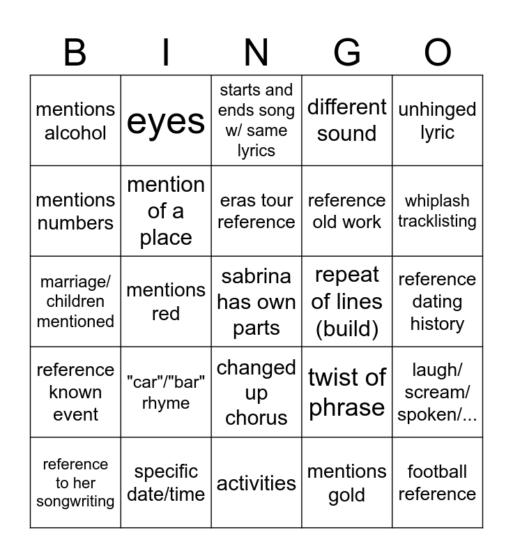 This bingo card has a free space and 24 words: "car"/"bar" rhyme, specific date/time, eras tour reference, reference to her songwriting, unhinged lyric, mentions alcohol, mentions numbers, eyes, repeat of lines (build), changed up chorus, reference old work, marriage/ children mentioned, twist of phrase, laugh/ scream/ spoken/..., mention of a place, mentions gold, reference dating history, starts and ends song w/ same lyrics, whiplash tracklisting, mentions red, football reference, reference known event, different sound and activities.
