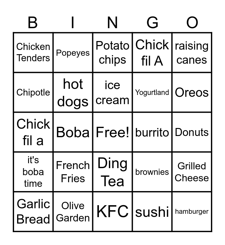 This bingo card has a free space and 64 words: McDonald"s, cookies, In N Out, sushi, fries, quesadilla, Popeyes, spaghetti, burrito, cheese, it's boba time, taco bell, brownies, raising canes, ketchup, hot dogs, ice cream, Chick fil A, pizza, Chipotle, Olive Garden, Ding Tea, Yogurtland, hamburger, Little Ceasar's, Taco Bell, Cheetos, Nachos, Donuts, Garlic Bread, Queso, Raising Canes, Taco Bell, Takis, Chick fil a, Bacon, Ramen, Cheese Burger, Cookies, Chicken Tenders, Boba, KFC, Soda, Doritos, Butter, French Fries, Chocolate, Milkshake, Oreos, Snapple, Subs, Ranch, Frappe, Grilled Cheese, Cheesesteak, Kool Aid, Potato chips, Starbucks, Burritos, Snickers, Steak, BBQ, Lo Mein and Fried Chicken.