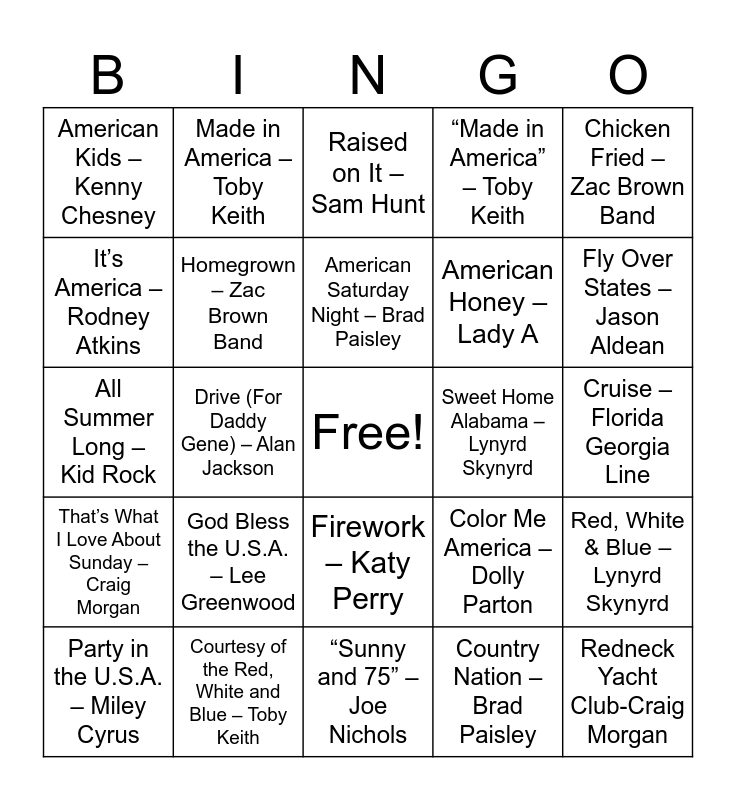 This bingo card has a free space and 24 words: God Bless the U.S.A. – Lee Greenwood, Courtesy of the Red, White and Blue – Toby Keith, American Saturday Night – Brad Paisley, Party in the U.S.A. – Miley Cyrus, Chicken Fried – Zac Brown Band, American Kids – Kenny Chesney, It’s America – Rodney Atkins, Made in America – Toby Keith, Sweet Home Alabama – Lynyrd Skynyrd, Firework – Katy Perry, American Honey – Lady A, All Summer Long – Kid Rock, Color Me America – Dolly Parton, Red, White & Blue – Lynyrd Skynyrd, Homegrown – Zac Brown Band, Country Nation – Brad Paisley, Cruise – Florida Georgia Line, Raised on It – Sam Hunt, Fly Over States – Jason Aldean, Drive (For Daddy Gene) – Alan Jackson, Redneck Yacht Club-Craig Morgan, That’s What I Love About Sunday – Craig Morgan, “Made in America” – Toby Keith and “Sunny and 75” – Joe Nichols.