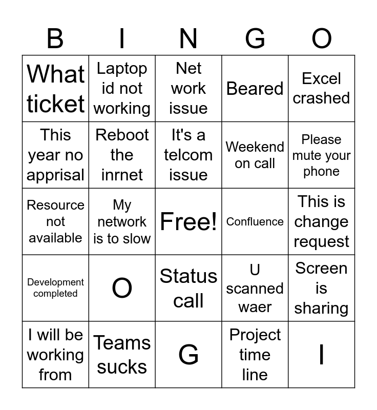 This bingo card has a free space and 52 words: B, I, N, G, O, Marke me cc, Laptop id not working, New girl, This year no apprisal, Mouse not working, Reboot the inrnet, Upload, Screen is sharing, U scanned waer, Zoom this, No items in que, It's a telcom issue, Confluence, You r speaking in mute, Excel crashed, My network is to slow, Project time line, What ticket, Weekend on call, That's sounds Great, Can u heare me now, Ms teams is very slow, There is bug in the code, Please mute your phone, There is an excelation, There is a rain, Beared, Head phones, Demo, There is 8 tickets 7 years old, Net work issue, Teams sucks, Have you completed at one to one, My Mike is not working, Sorry iam in speaking in mute, Ooo ping me once your free, This is change request, Development completed, DLL is not working, Status call, My laptop battery is low, Birthday cacke, Resource not available, You to work kn weekend, Have received amzon voucher, I will be working from and Few people will get 50%.