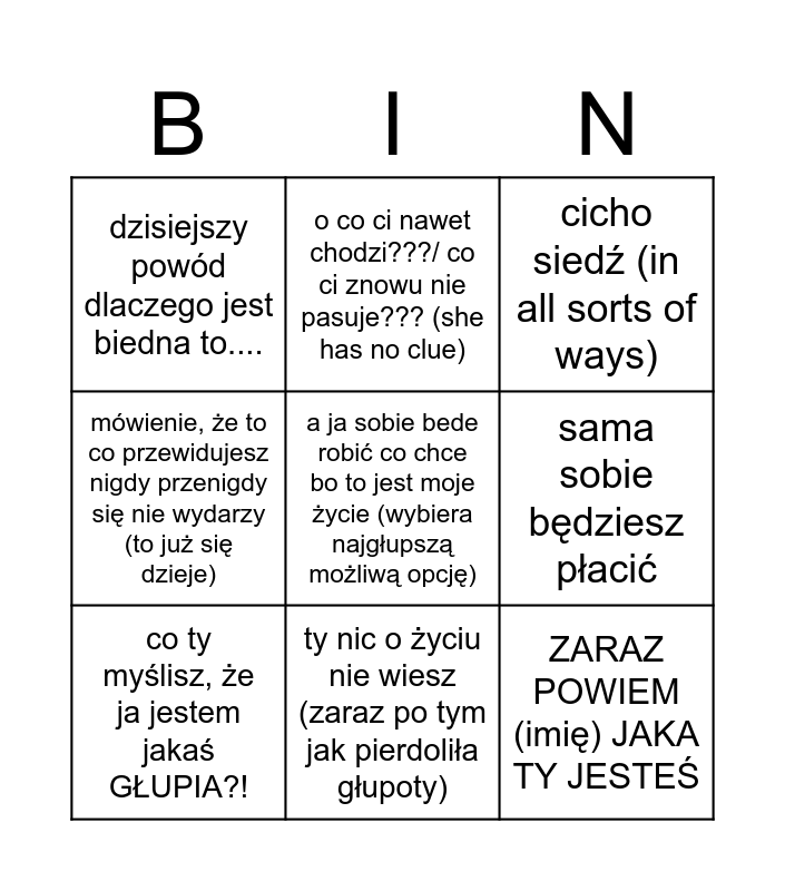 This bingo card has a free space and 8 words: sama sobie będziesz płacić, cicho siedź (in all sorts of ways), o co ci nawet chodzi???/ co ci znowu nie pasuje??? (she has no clue), co ty myślisz, że ja jestem jakaś GŁUPIA?!, dzisiejszy powód dlaczego jest biedna to...., ZARAZ POWIEM (imię) JAKA TY JESTEŚ, mówienie, że to co przewidujesz nigdy przenigdy się nie wydarzy (to już się dzieje) and ty nic o życiu nie wiesz (zaraz po tym jak pierdoliła głupoty).