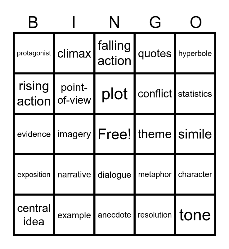This bingo card has a free space and 28 words: character, setting, conflict, resolution, rising action, falling action, climax, exposition, theme, central idea, evidence, quotes, example, anecdote, statistics, fact, narrative, point-of-view, plot, dialogue, protagonist, antagonist, tone, imagery, simile, metaphor, hyperbole and personification.
