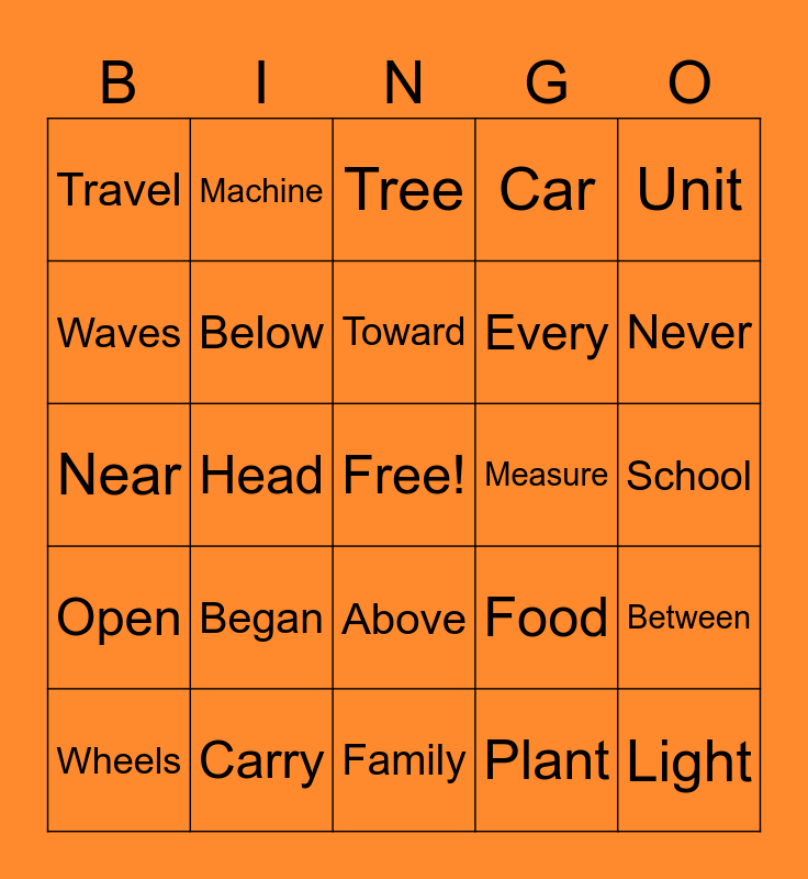 This bingo card has a free space and 24 words: Began, Carry, Toward, Wheels, Unit, Travel, Waves, Machine, Measure, Above, Every, Near, Food, Between, Below, Plant, School, Tree, Never, Head, Light, Open, Car and Family.