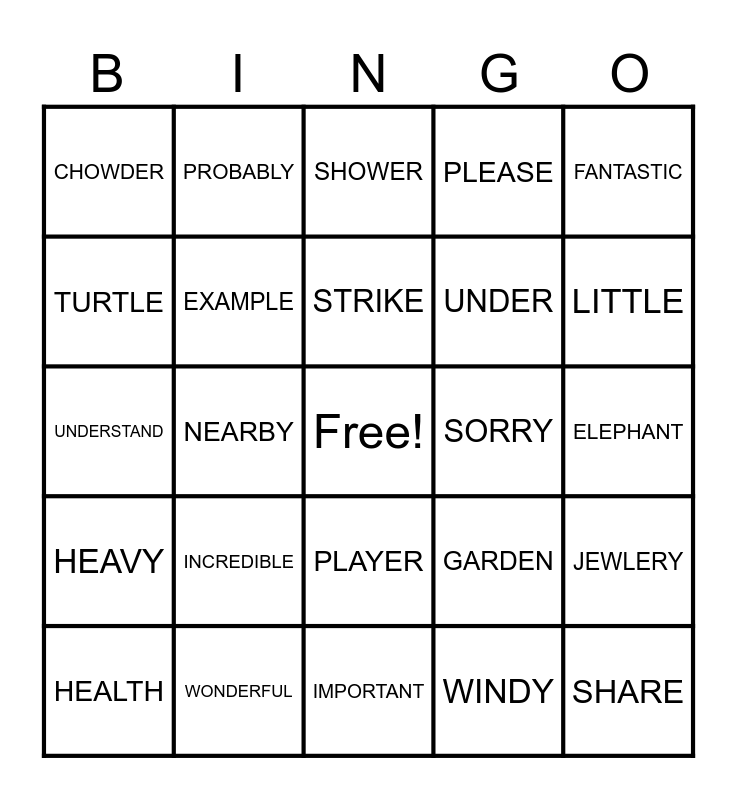 This bingo card has a free space and 44 words: WINDOW, SHARE, HEART, HEALTH, BEGIN, WINDY, SHOWER, ZEBRA, FANTASTIC, WONDERFUL, PLEASE, SORRY, PLAYER, INCREDIBLE, REGISTER, IMPORTANT, UNDO, UNDERSTAND, VISIT, LITTLE, PROBABLY, WHAT, BRITTLE, CHOWDER, DANCER, ELEPHANT, PHONE, FLOWING, GARDEN, HEAVY, INCLUDE, JEWLERY, KINDNESS, MARRIAGE, NEARBY, OPERA, QUEEN, RESET, STRIKE, TURTLE, UNDER, YEARLY, EXAMPLE and BRAZEN.