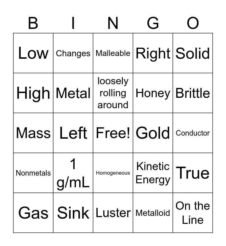 This bingo card has a free space and 24 words: 1 g/mL, Sink, loosely rolling around, Gas, Solid, Low, High, Changes, Gold, Homogeneous, Honey, Mass, Kinetic Energy, True, Metal, Metalloid, Conductor, Malleable, Brittle, Left, On the Line, Nonmetals, Right and Luster.