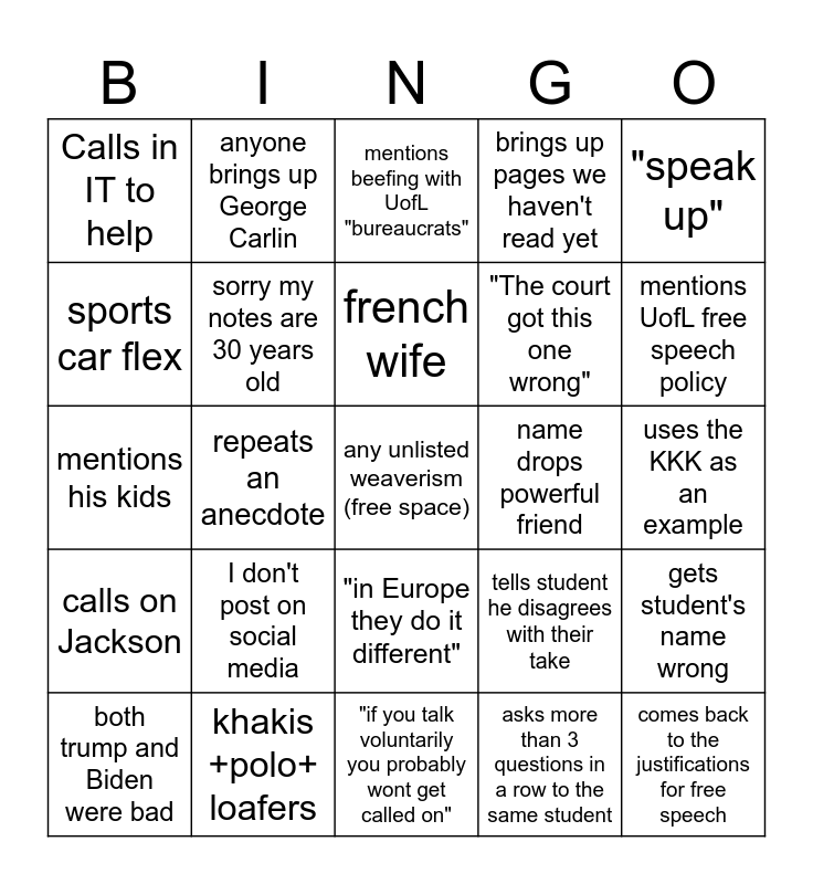 This bingo card has a free space and 24 words: I don't post on social media, khakis +polo+ loafers, french wife, both trump and Biden were bad, "speak up", Calls in IT to help, sports car flex, anyone brings up George Carlin, name drops powerful friend, "in Europe they do it different", "The court got this one wrong", mentions his kids, tells student he disagrees with their take, gets student's name wrong, sorry my notes are 30 years old, asks more than 3 questions in a row to the same student, uses the KKK as an example, mentions beefing with UofL "bureaucrats", mentions UofL free speech policy, repeats an anecdote, comes back to the justifications for free speech, calls on Jackson, brings up pages we haven't read yet and "if you talk voluntarily you probably wont get called on".