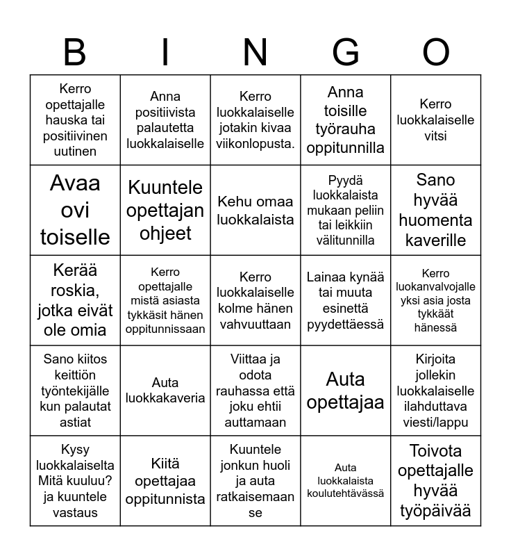 This bingo card has a free space and 24 words: Auta luokkakaveria, Kiitä opettajaa oppitunnista, Kehu omaa luokkalaista, Kysy luokkalaiselta Mitä kuuluu? ja kuuntele vastaus, Kerro luokkalaiselle vitsi, Kerro opettajalle hauska tai positiivinen uutinen, Avaa ovi toiselle, Anna positiivista palautetta luokkalaiselle, Lainaa kynää tai muuta esinettä pyydettäessä, Viittaa ja odota rauhassa että joku ehtii auttamaan, Pyydä luokkalaista mukaan peliin tai leikkiin välitunnilla, Kerää roskia, jotka eivät ole omia, Auta opettajaa, Kirjoita jollekin luokkalaiselle ilahduttava viesti/lappu, Kuuntele opettajan ohjeet, Auta luokkalaista koulutehtävässä, Kerro luokanvalvojalle yksi asia josta tykkäät hänessä, Kerro luokkalaiselle jotakin kivaa viikonlopusta., Sano hyvää huomenta kaverille, Kerro opettajalle mistä asiasta tykkäsit hänen oppitunnissaan, Toivota opettajalle hyvää työpäivää, Sano kiitos keittiön työntekijälle kun palautat astiat, Anna toisille työrauha oppitunnilla and Kuuntele jonkun huoli ja auta ratkaisemaan se.