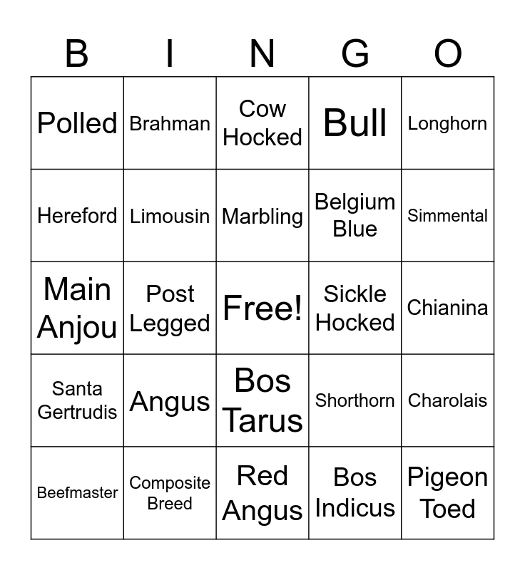 This bingo card has a free space and 24 words: Angus, Composite Breed, Marbling, Beefmaster, Longhorn, Polled, Hereford, Brahman, Sickle Hocked, Bos Tarus, Belgium Blue, Main Anjou, Shorthorn, Charolais, Limousin, Bos Indicus, Chianina, Cow Hocked, Simmental, Post Legged, Pigeon Toed, Santa Gertrudis, Bull and Red Angus.