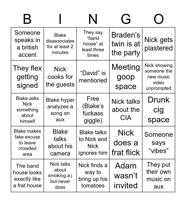 This bingo card has a free space and 24 words: Blake talks about his camera, Nick talks about smoking a j but never does, “David” is mentioned, The band house looks exactly like a frat house, Nick gets plastered, Someone speaks in a british accent, They flex getting signed, Blake disassociates for at least 2 minutes, Nick talks about the CIA, Blake talks to Nick and Nick ignores him, Meeting goop space, Blake asks Nick something about himself, Nick does a frat flick, Someone says “vibes”, Nick cooks for the guests, Adam wasn’t invited, Drunk cig space, They say “band house” at least three times, Nick showing someone the new music video unprompted, Blake hyper analyzes a song on aux, They put their own music on aux, Blake makes fake excuse to leave crowded area, Braden’s twin is at the party and Nick finds a way to bring up his tomatoes.