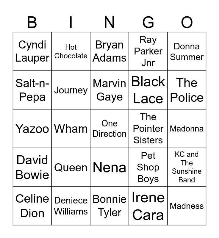 This bingo card has a free space and 29 words: Celine Dion, Elton John, Wham, Abba, Cyndi Lauper, Bryan Adams, Journey, Queen, The Pointer Sisters, Deniece Williams, Madonna, Madness, Bonnie Tyler, Irene Cara, The Police, Prince, Nena, David Bowie, Donna Summer, Yazoo, Pet Shop Boys, The Jam, Black Lace, Salt-n-Pepa, Ray Parker Jnr, Hot Chocolate, KC and The Sunshine Band, Marvin Gaye and Erasure.