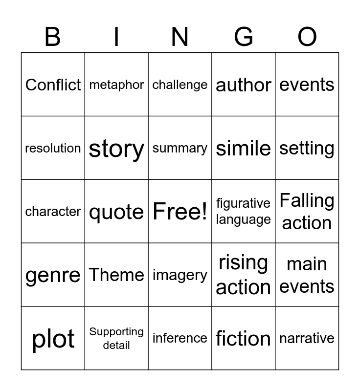 This bingo card has a free space and 24 words: Theme, Supporting detail, summary, plot, events, Conflict, resolution, metaphor, figurative language, imagery, simile, character, rising action, main events, story, fiction, Falling action, challenge, setting, quote, narrative, genre, author and inference.