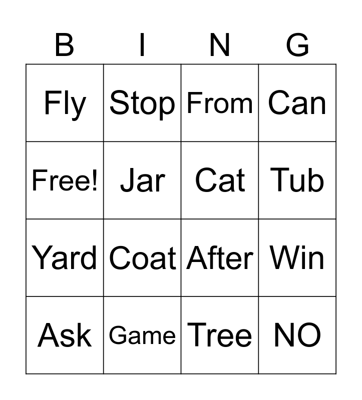 This bingo card has 16 words: Game, Win, From, Fly, Yard, Stop, After, Tree, Free!, Jar, Ask, Can, Coat, Tub, Cat and NO.