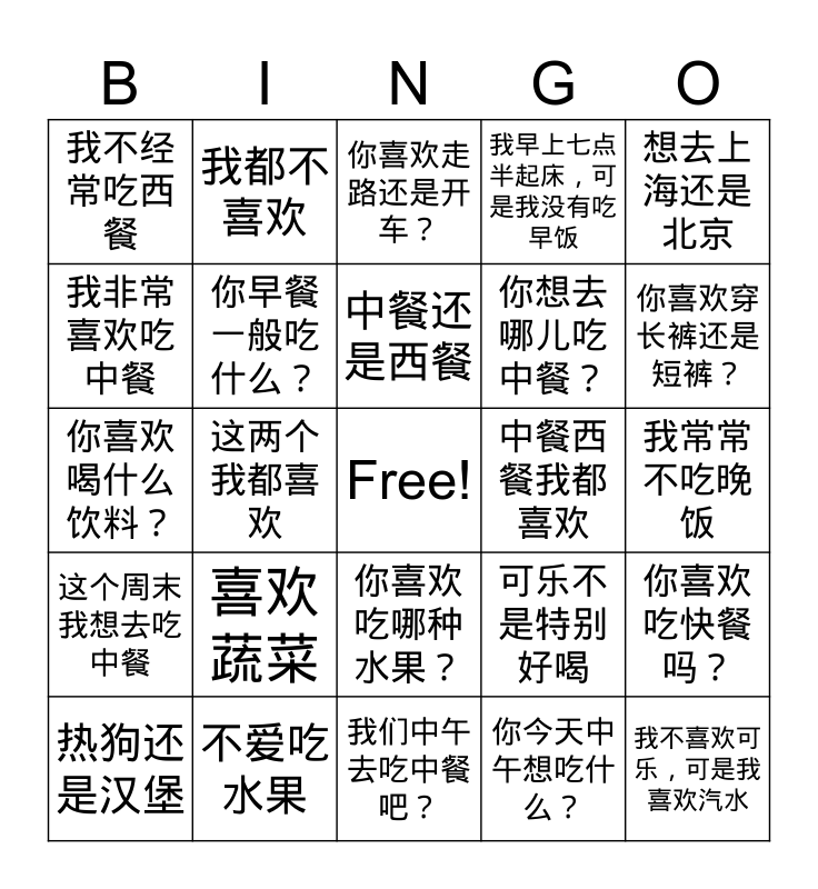 蔬菜水果和中餐西餐 | sentence bingo | 要自己带吃的和喝的 | 你想喝什么? | 第7课