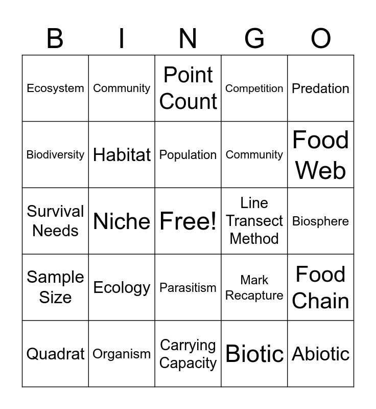 This bingo card has a free space and 24 words: Ecology, Organism, Population, Quadrat, Predation, Ecosystem, Biodiversity, Community, Line Transect Method, Parasitism, Community, Survival Needs, Mark Recapture, Food Chain, Habitat, Biotic, Biosphere, Point Count, Food Web, Niche, Abiotic, Sample Size, Competition and Carrying Capacity.