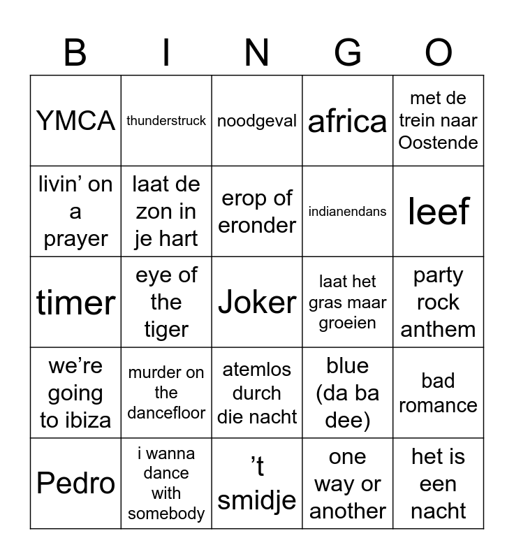 This bingo card has a free space and 57 words: europapa, Pedro, ochtendgymnastiek, YMCA, ’t smidje, the ketchup song, laat de zon in je hart, zeg eens meisje, indianendans, the hucklebuck, africa, I want it that way, Gimme! Gimme! Gimme! (a man after midnight), …Baby one more time, single ladies, wannabe, met de trein naar Oostende, eye of the tiger, wake me up before you go-go, het is een nacht, laat het gras maar groeien, sweet dreams (are made of this), blue (da ba dee), noodgeval, I want to break free, erop of eronder, boom, boom, boom, boom, ik ga zwemmen, leef, everytime we touch, waka waka, alors on danse, pump it up, I gotta feeling, party rock anthem, livin’ on a prayer, nobody’s wife, timer, umbrella, we’re going to ibiza, thunderstruck, atemlos durch die nacht, vuurwerk, 99 luftballons, verdammt ich lieb’ dich, sk8er boi, murder on the dancefloor, i wanna dance with somebody, l’amour toujours, conga!, wrecking ball, one way or another, mama laudaaa, i don’t feel like dancing, believe, bad romance and macarena.