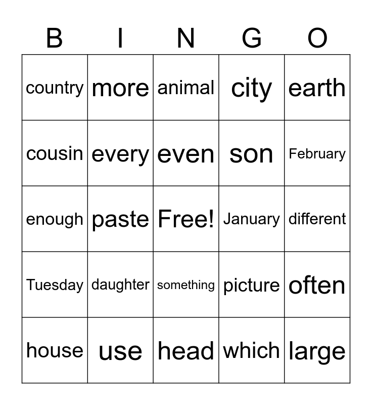 This bingo card has a free space and 79 words: again, America, animal, answer, August, away, beautiful, bought, breakfast, brother, carry, change, city, country, couple, cousin, dance, daughter, December, different, early, earth, enough, even, every, example, eye, family, father, favorite, February, great, head, here, house, January, July, knew, know, large, laugh, learn, library, lose, Monday, more, mother, move, neighbor, ocean, often, paste, picture, piece, place, ready, right, Saturday, school, something, son, special, sugar, their, thought, Thursday, together, too, trouble, Tuesday, use, used, water, Wednesday, when, which, why, world and young.