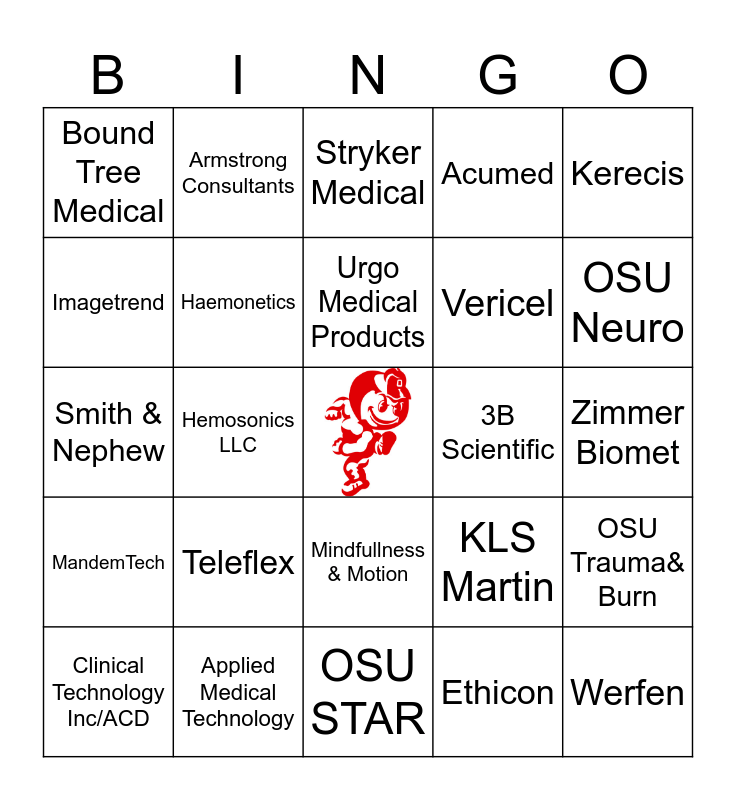 This bingo card has a free space and 24 words: Teleflex, Applied Medical Technology, Urgo Medical Products, Clinical Technology Inc/ACD, Kerecis, Bound Tree Medical, Imagetrend, Armstrong Consultants, 3B Scientific, Mindfullness & Motion, Vericel, Smith & Nephew, KLS Martin, OSU Trauma& Burn, Haemonetics, Ethicon, Zimmer Biomet, Stryker Medical, OSU Neuro, Hemosonics LLC, Werfen, MandemTech, Acumed and OSU STAR.