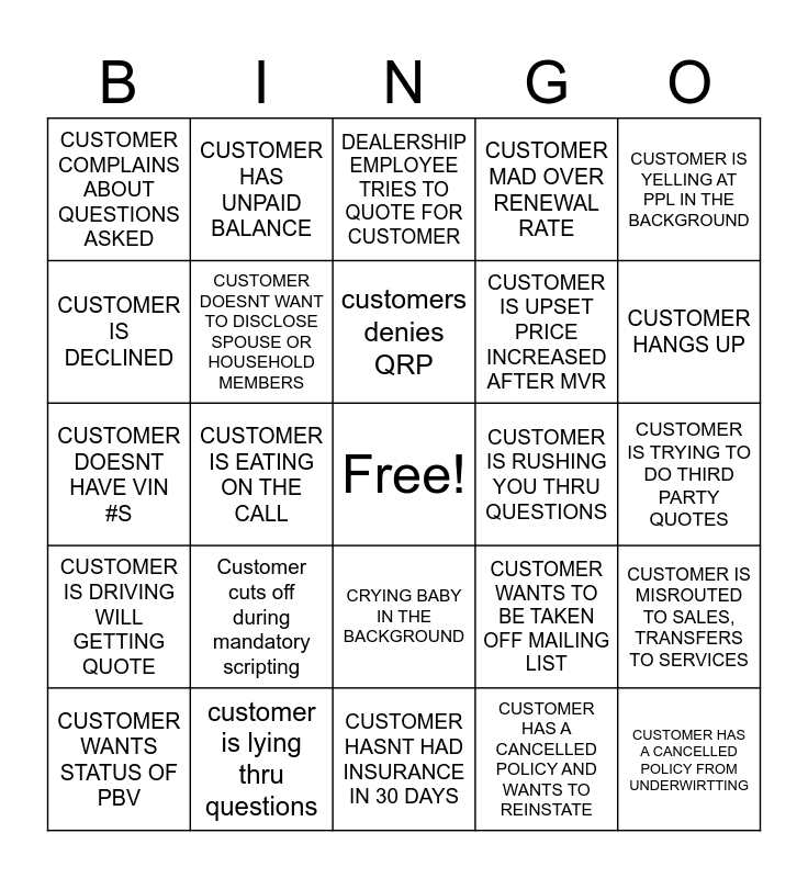 This bingo card has a free space and 24 words: Customer cuts off during mandatory scripting, customer is lying thru questions, customers denies QRP, CUSTOMER WANTS STATUS OF PBV, CUSTOMER IS YELLING AT PPL IN THE BACKGROUND, CUSTOMER COMPLAINS ABOUT QUESTIONS ASKED, CUSTOMER IS DECLINED, CUSTOMER HAS UNPAID BALANCE, CUSTOMER IS RUSHING YOU THRU QUESTIONS, CRYING BABY IN THE BACKGROUND, CUSTOMER IS UPSET PRICE INCREASED AFTER MVR, CUSTOMER DOESNT HAVE VIN #S, CUSTOMER WANTS TO BE TAKEN OFF MAILING LIST, CUSTOMER IS MISROUTED TO SALES, TRANSFERS TO SERVICES, CUSTOMER DOESNT WANT TO DISCLOSE SPOUSE OR HOUSEHOLD MEMBERS, CUSTOMER HAS A CANCELLED POLICY AND WANTS TO REINSTATE, CUSTOMER IS TRYING TO DO THIRD PARTY QUOTES, DEALERSHIP EMPLOYEE TRIES TO QUOTE FOR CUSTOMER, CUSTOMER HANGS UP, CUSTOMER IS EATING ON THE CALL, CUSTOMER HAS A CANCELLED POLICY FROM UNDERWIRTTING, CUSTOMER IS DRIVING WILL GETTING QUOTE, CUSTOMER MAD OVER RENEWAL RATE and CUSTOMER HASNT HAD INSURANCE IN 30 DAYS.